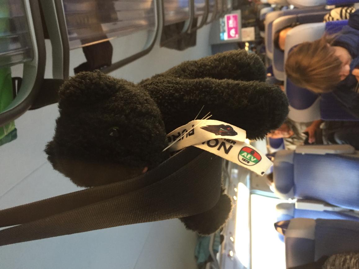 mir ist diese Anfrage unangenehm, weil ich nicht verstehe, dass wir diesen "Panther"-Scheiß nicht längst gelassen haben und uns stattdessen vollauf als "AEV" begreifen. Aber, nun, meine Tochter hier fernab der Augsburger Heimat hat einmal diesen Kuscheltier-AEV-Panther geschenkt bekommen und sehr ins Herz geschlossen: