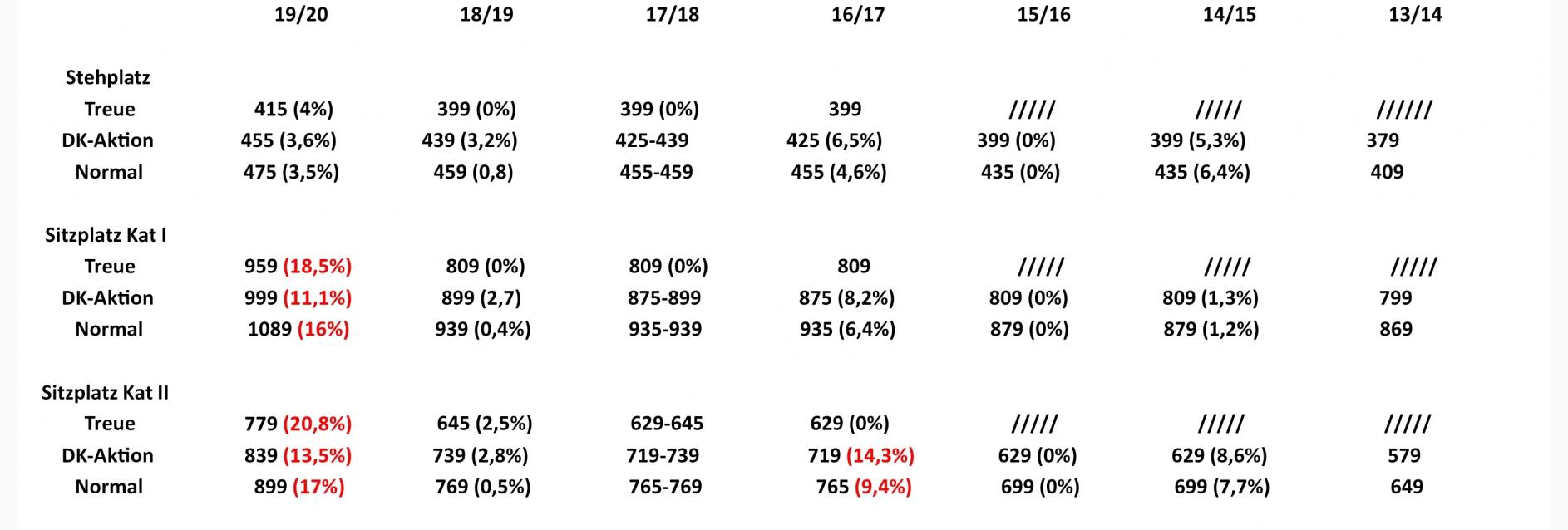 Habe mal spaßeshalber die letzten Heimspiele durchgeklickt. Es gibt für KEIN einziges Spiel mehr Karten in den Sitzblöcken D, E, G und H. Kategorie 2 also. Das sind die Plätze, die am meisten von der Erhöhung betroffen sind. Für die meisten Spiele sind gar keine Sitzplätze, oder nur noch vereinzelte zu haben. Stehplätze hingegen gibt es noch für jedes Spiel. Das nur als kleiner Einblick in die betriebswirtschaftlichen Überlegungen der erheblich größeren Erhöhung bei den Sitz-, gegenüber der sehr moderaten Anpassung bei den Stehplätzen, ohne das jetzt bedingungslos gut zu heißen.