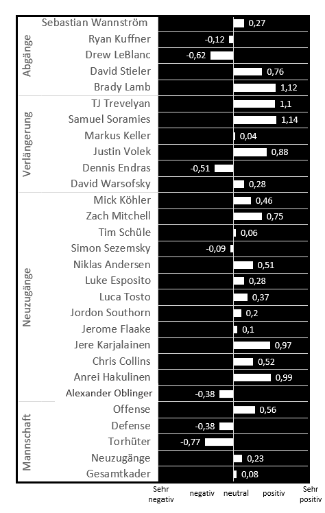 79% der Transferentscheidungen (19 von 24) werden von den Fans eher oder sehr positiv beurteilt. Am kontroversten dabei waren v.a. der Abgang von LeBlanc (2,3 8) , die Weiterverpflichtung von Dennis Endras (2,49) und die Verpflichtung von Alexander Oblinger (2,62), große Zustimmung gab es hingegen zu den Verlängerungen im deutschen Sektor mit Soramies (4,14), TJ (4,1) und Volek (3,8 8) sowie den Abgängen der lanjährigen Spieler im Kader, bspw. Lamb (4,12) oder Stieler (3,76). Durchwegs positiv sehen die Fans die vergebenen 6 AL-Stellen im Sturm mit einem Schnitt von 3,67 (Range: 3,22 - 3,99).
