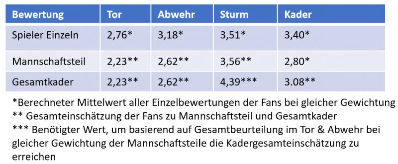 Wie unter Punkt 3 beschrieben fließt bei der Gesamtbewertung der Mannschaftsteile gegenüber der Einzelbewertung auf der Fit des vorhandenen Personals zu nen jeweiligen Stellen im Kader eine wichtige Rolle, wodurch sich auch die Diskrepanz zwischen A) und C) erklären lässt. Schwieriger zu erklären ist die Diskrepanz zwischen B), welches mit 2,80 bei gleicher Gewichtung der Mannschaftsteile noch deulich unter des Gesamteinschätzung des Kaders (C) von 3,08 liegt. Dies bedeutet entweder, dass die Fans bei ihrer Gesamtbeurteilung die positiven Veränderungen im Sturm höher gewichten gegenüber den Torhütern und der Abwehr, oder aber dass die Einschätzungen der Fans zu Torhüter und Abwehr isoliert betrachtet zu skeptisch waren.