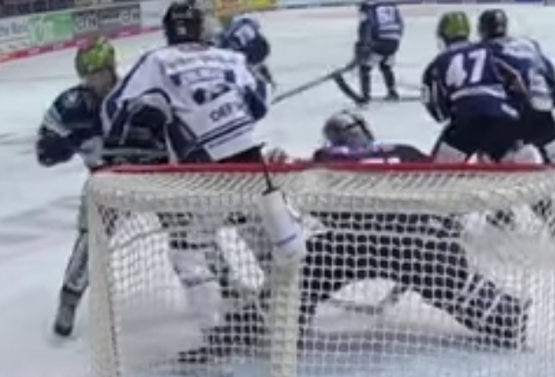 Allerdings verliert er den Helm bei einem Kontakt der deshalb zustande kommt, weil der Straubinger den Iserlohner in den Torraum und damit auch in Vogl schiebt.