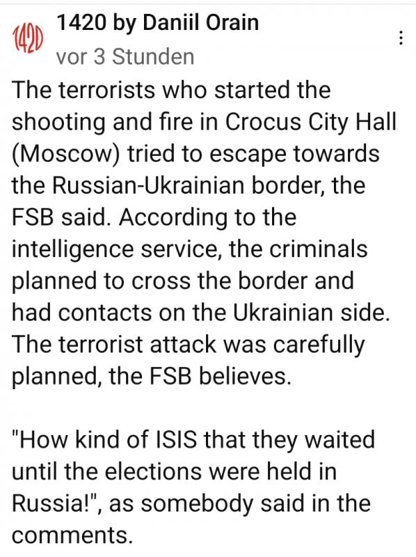 Ich bin ja eigentlich echt kein Fan von solchen Theorien, aber das Timing mit Wahlgewinn Putins, massive Luftangriffe seitens der Russen, erstmalige Verwendung des Wortes "Krieg" und jetzt dieser Anschlag in Moskau. Alles sehr komisch als Außenstehender, weiß nicht.