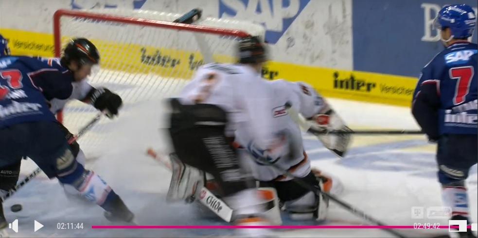 Es gibt nur eine Aufnahme von der Hauptkamera (bzw. die Nahaufnahme), wo man erkennen kann, dass die Scheibe nicht von Likens abgefälscht wird, sondern tief auf dem Eis vom Mannheimer Spieler abprallt. Den eigentlichen Kontakt Puck-Schlittschuh sehe ich da aber auch nicht, aber die Scheibe kann nur von dort kommen, wenn man die Bewegung des Pucks zurückverfolgt.