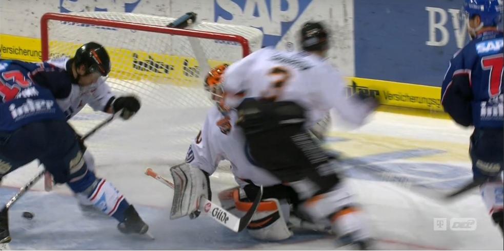 Kink bremst in die Scheibe rein und das wird laut DEL-Regelauslegung als Schlittschuhtor nicht gegeben.